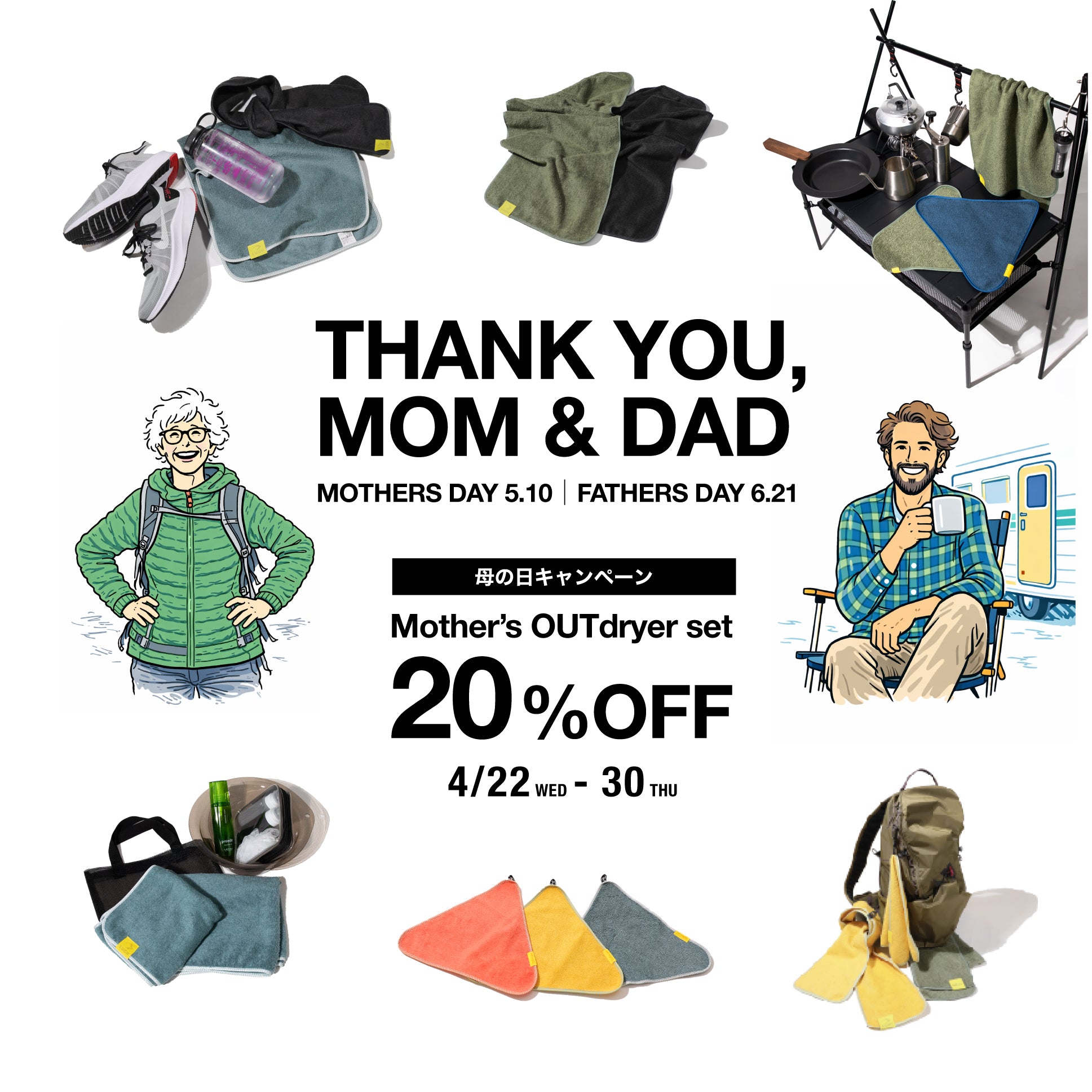 「LUGH OUTdryer」は、特許取得のハイスペックコットンタオル。「高吸水」で「伸びる」から拭く・羽織る・巻くと様々なアレンジが可能。アウトドアシーンのおともに。