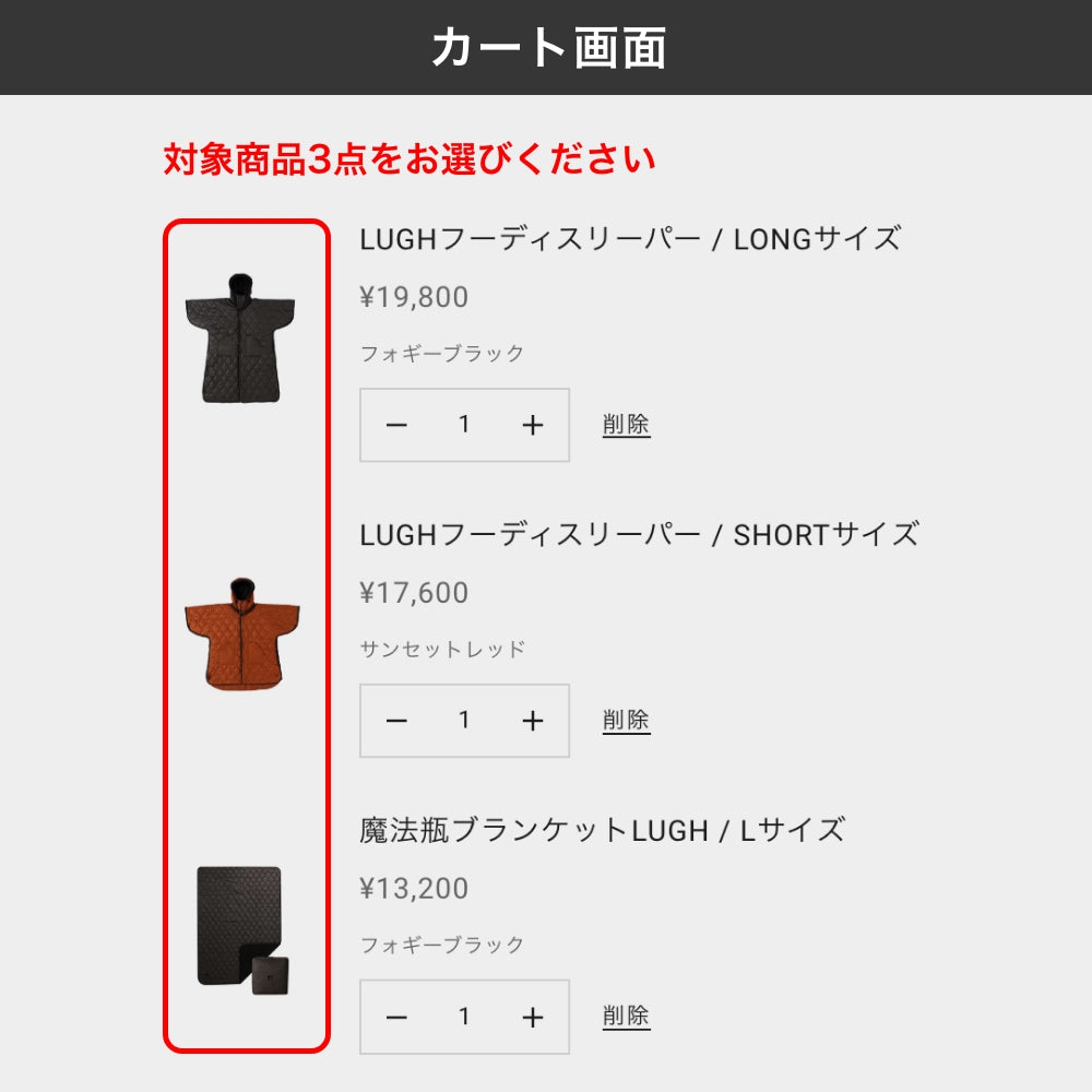 対象商品の中から3点をお選びいただき、各商品を「カートに追加」ボタンをクリックして、カート画面へ進んでください。