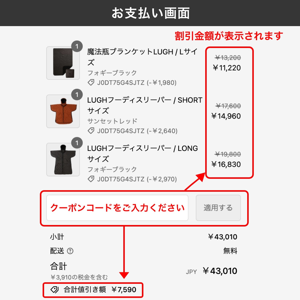 お支払い画面のご注文概要にある「クーポンコード」入力欄にクーポンコードをご入力し「適用する」をクリックすると、15%OFFされた金額が表示されます。