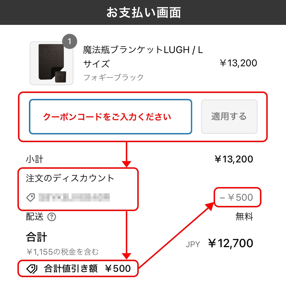 お支払い画面のご注文概要にある「クーポンコード」入力欄にクーポンコードをご入力し「適用する」をクリックすると、クーポン500円お値引きされれた金額が表示されます。