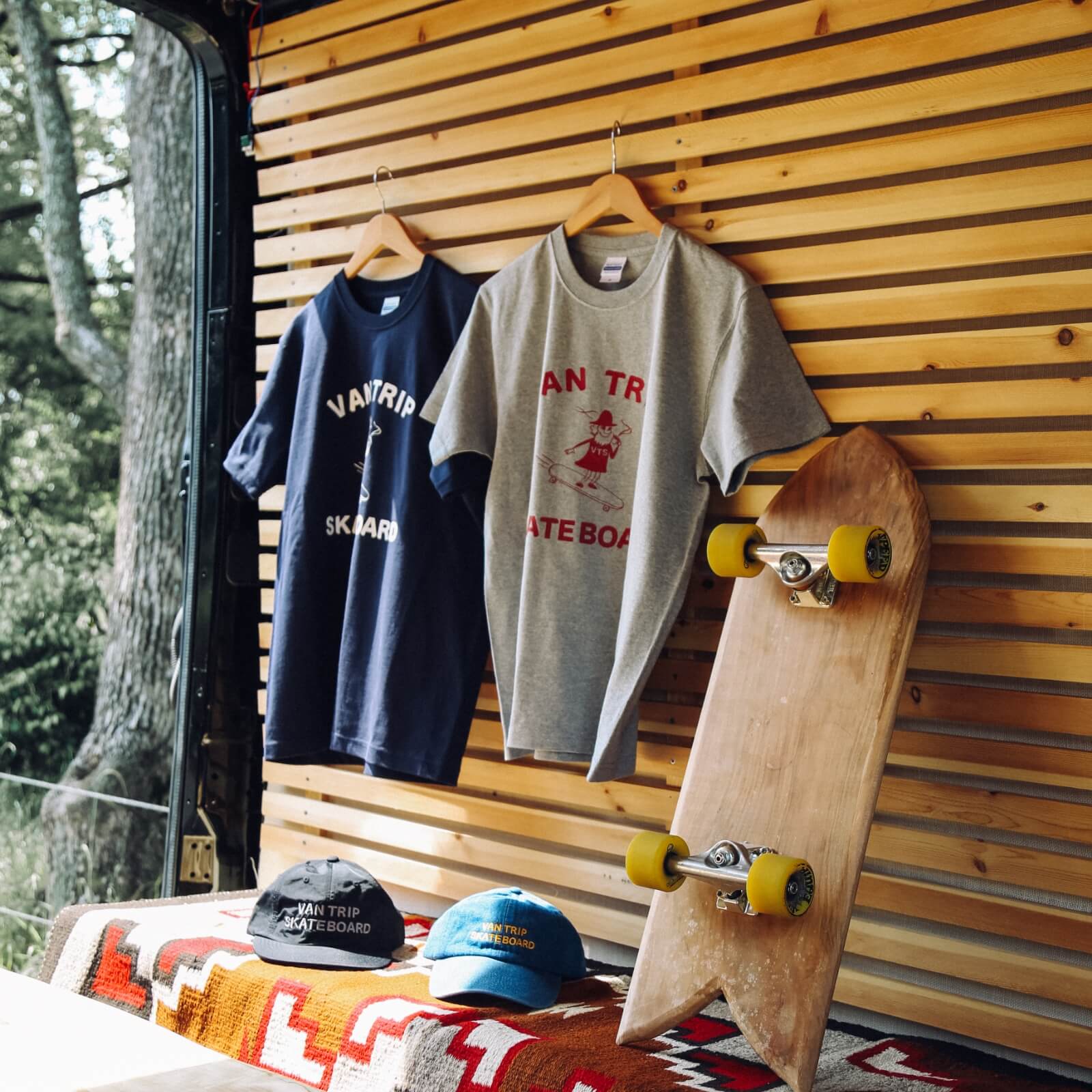 VAN TRIP SKATEBOARDでは、自分たちの手でデザインしたTシャツやキャップなどのアイテム展開中。