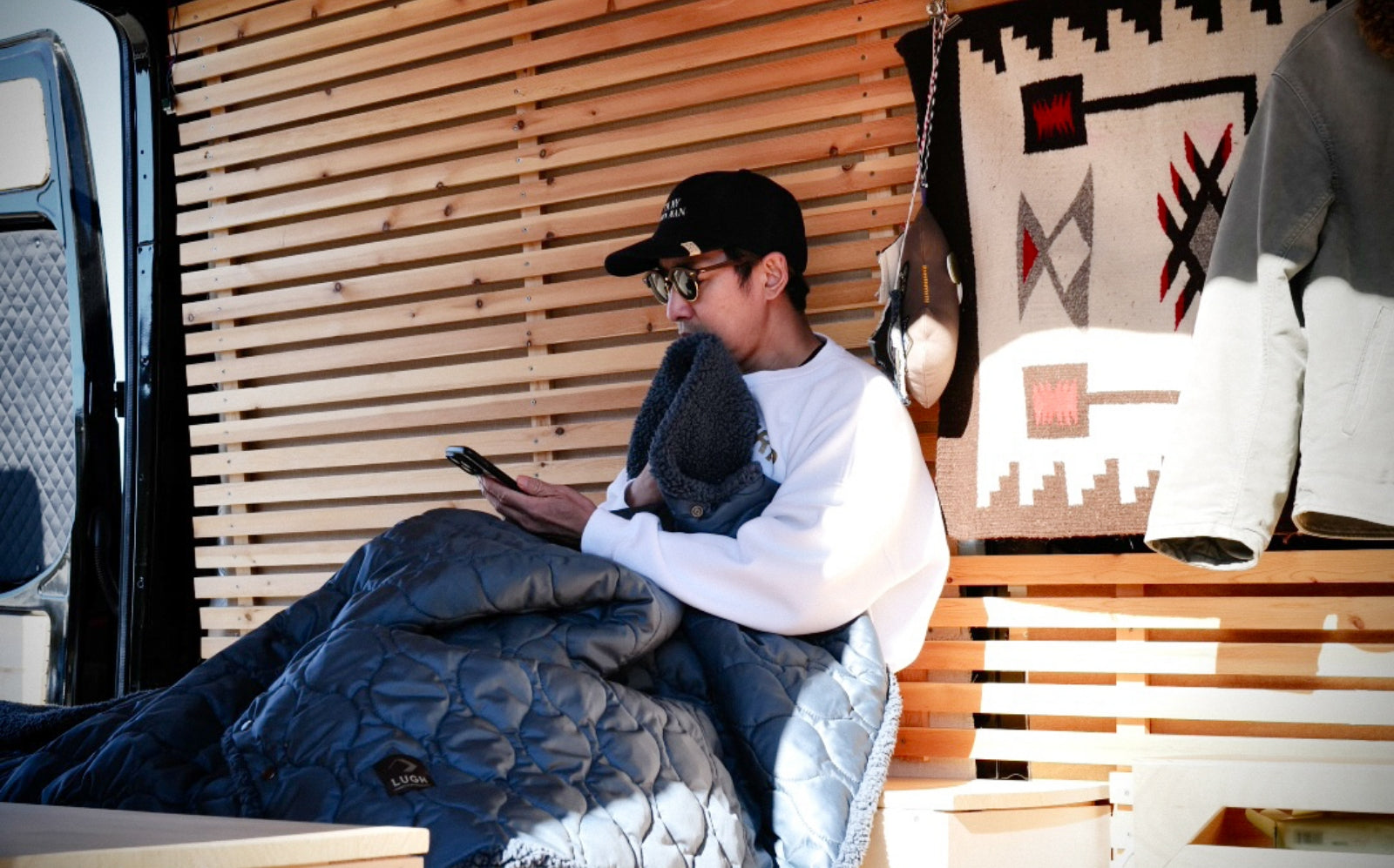 魔法瓶ブランケット「LUGH」が自宅にとどいて、まず気に入ったのがパッケージの収納袋がオシャレでカッコいいって事。持ち運びもしやすいしクッションとしていいかも!?ってワクワクしました。自分のクルマ(sprinter)は大きさを活かして、通常は椅子とテーブルを配置。それが車中泊の旅に行く時はベットになるっていう2WAYです。いつもはクッションとして置いて、車中泊の旅に出る時はブランケットとして使用してっていう、同じ2WAYだなって愛着がわきました。