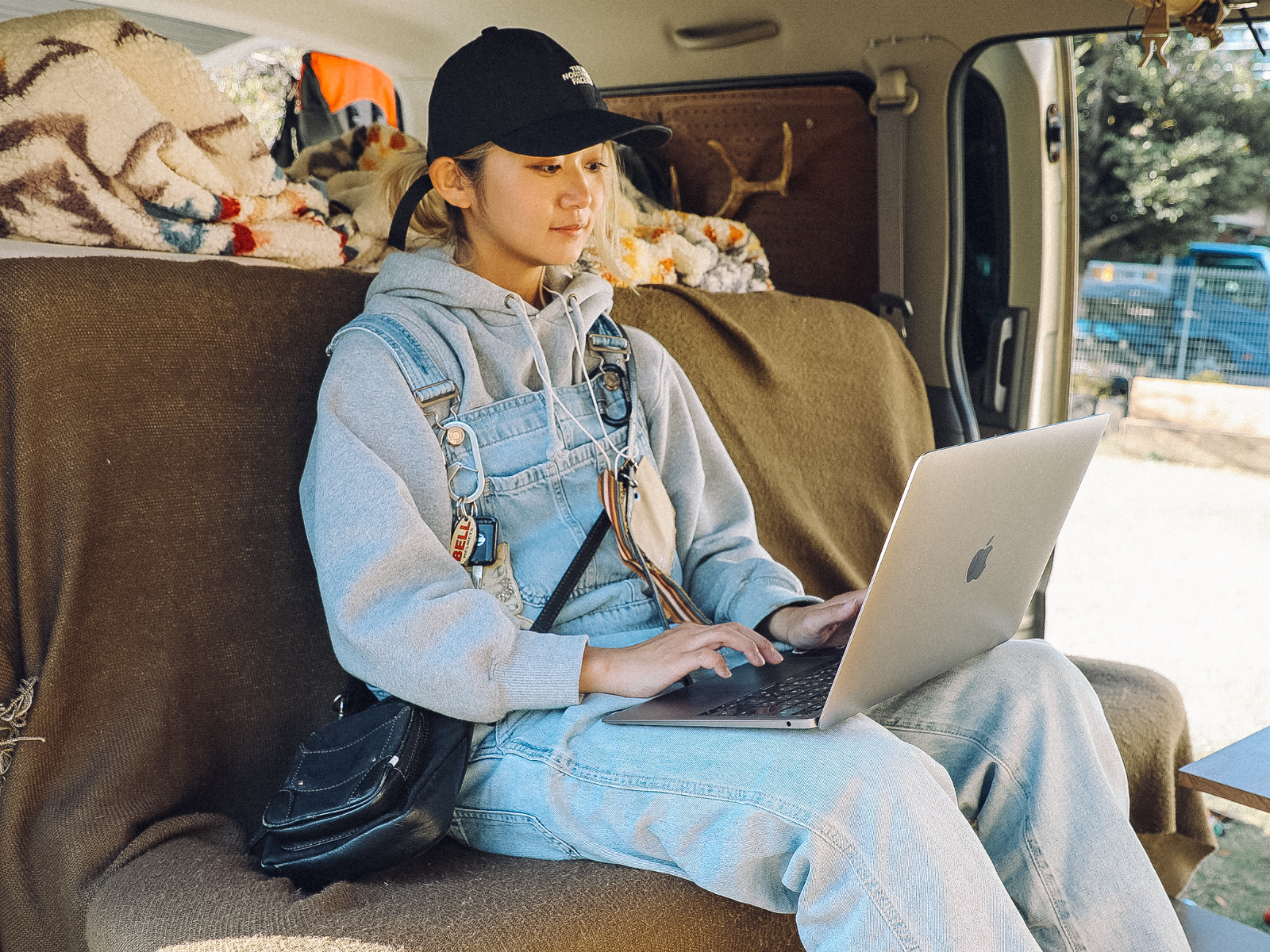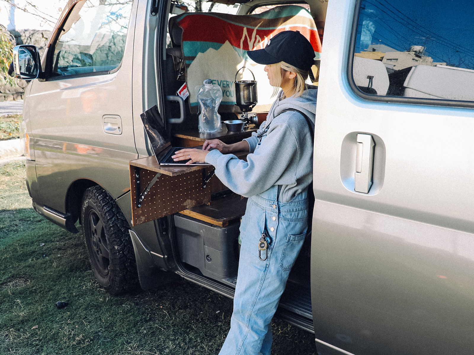 愛犬と外遊びを楽しみながら、動くオフィスとしても使える愛車キャラバンでのバンライフは、最高のノマドワーク環境。行動力ある片寄さんの良き相棒となっている。こうしたバンライフで過ごす日々のなかでも特にお気に入りだと話すのが、夏のバンライフの過ごし方なんだとか。