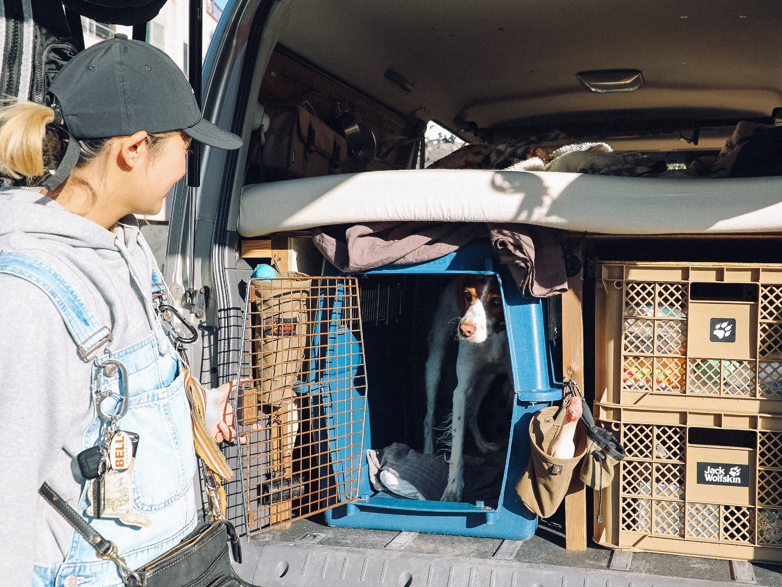 「もともと軽バンでよく車中泊をしてたんですが、狭いという点が一番の課題で。中型犬の大きなケージを車内に置いたまま、夫と二人で広々と車中泊をしたいなって思って、今のクルマに買い替えたんです。安価で見た目も可愛いクルマを車屋さんに提案してもらって、実物を見ずに即決しちゃいました笑」