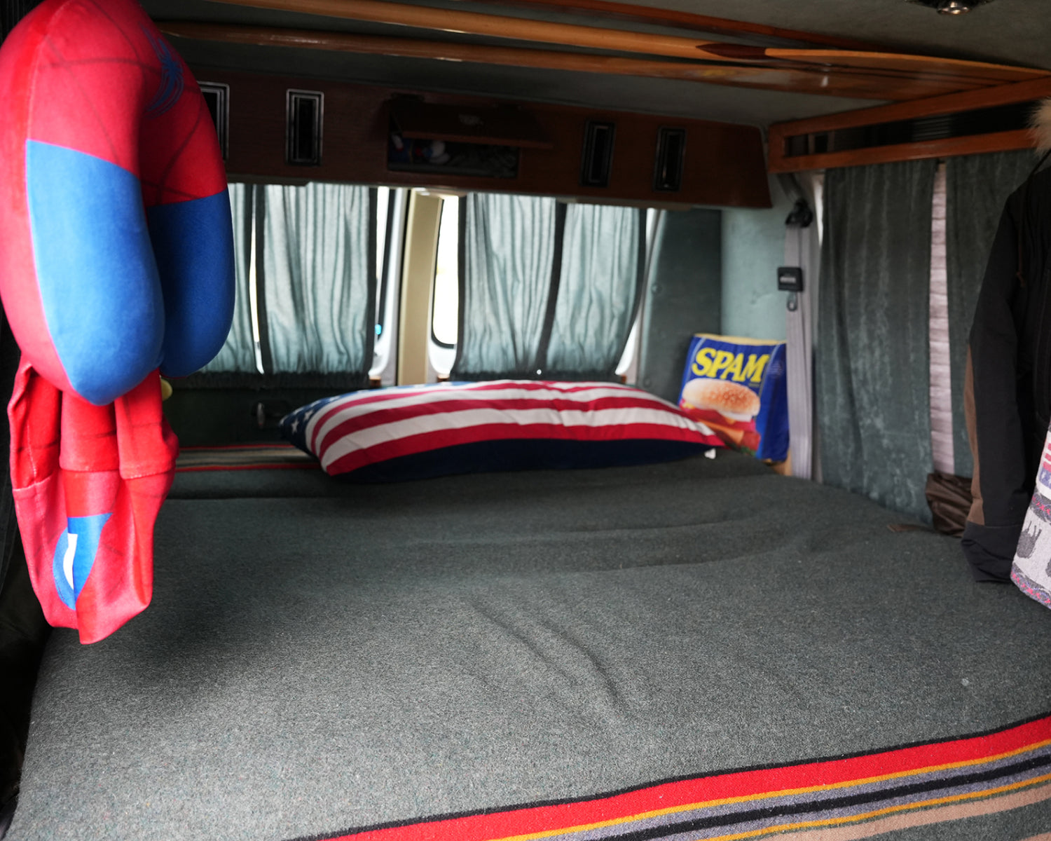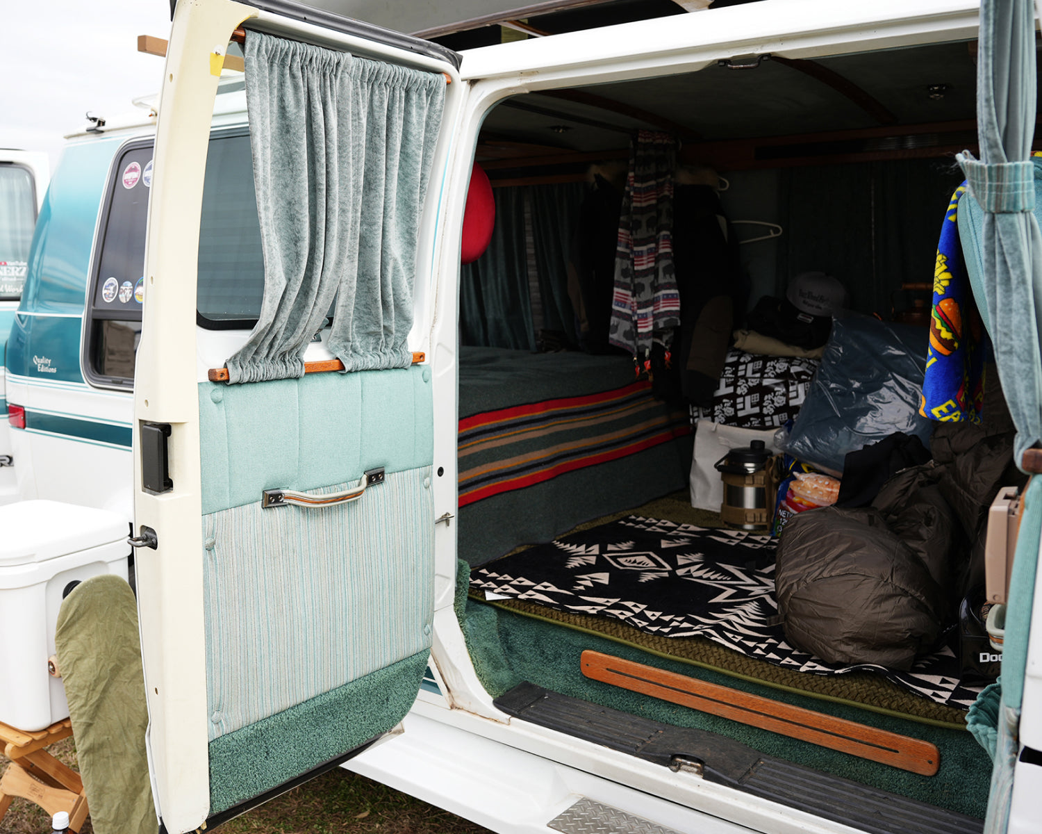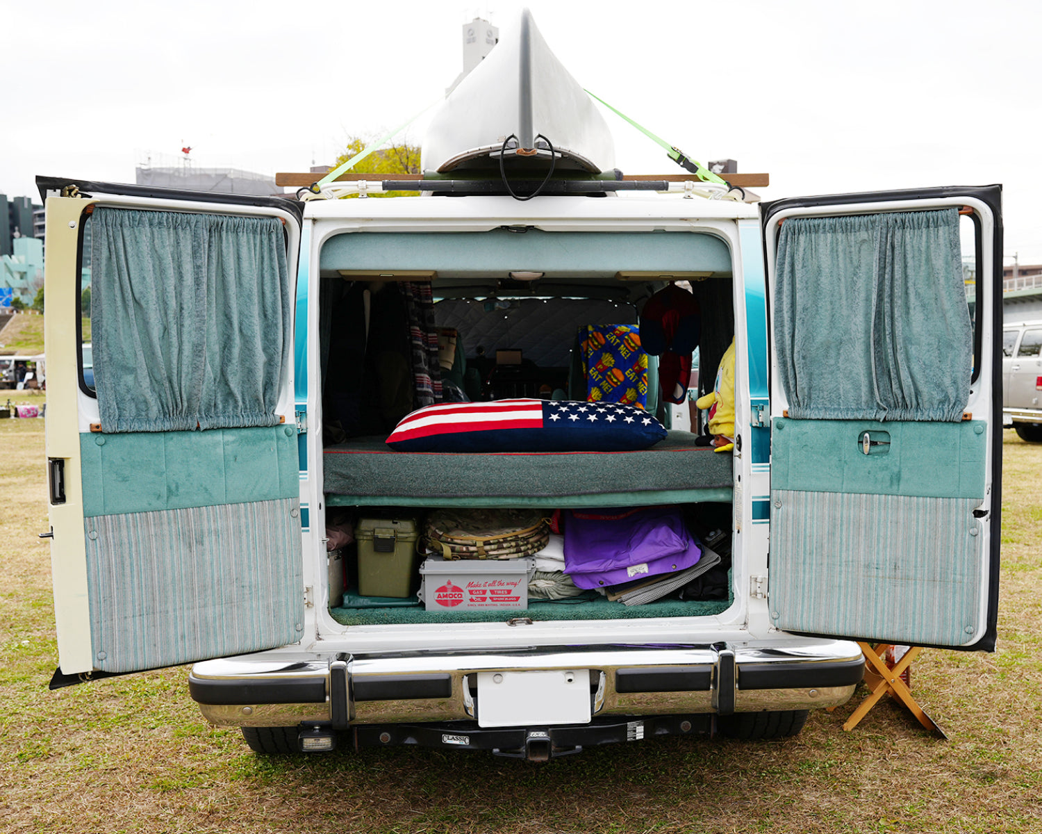 スカイラインGT-R(R33)やアルファード、グランドチェロキーを乗り継ぎ、ハーレーダビッドソンにも乗ってきたが、「家族の時間」を軸に据えた今、このフルサイズバンが暮らしの中心にある。もともとアメリカンカルチャーに強い関心があり、その空気感に惹かれるようにアメ車のフルサイズバンという選択にたどり着いた。車内にはベッドを設え、家族でゆったりと過ごせる空間を確保。キャンプやカヌーといったアウトドアを軸に、移動と滞在をシームレスに楽しむスタイルが定着している。