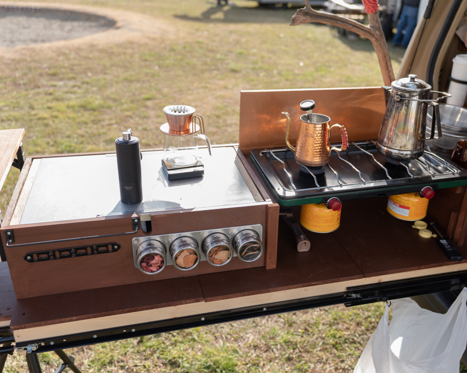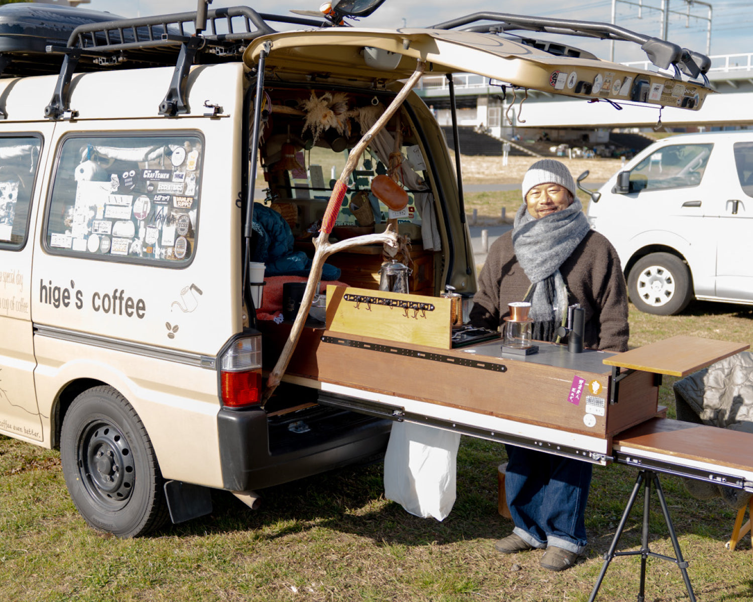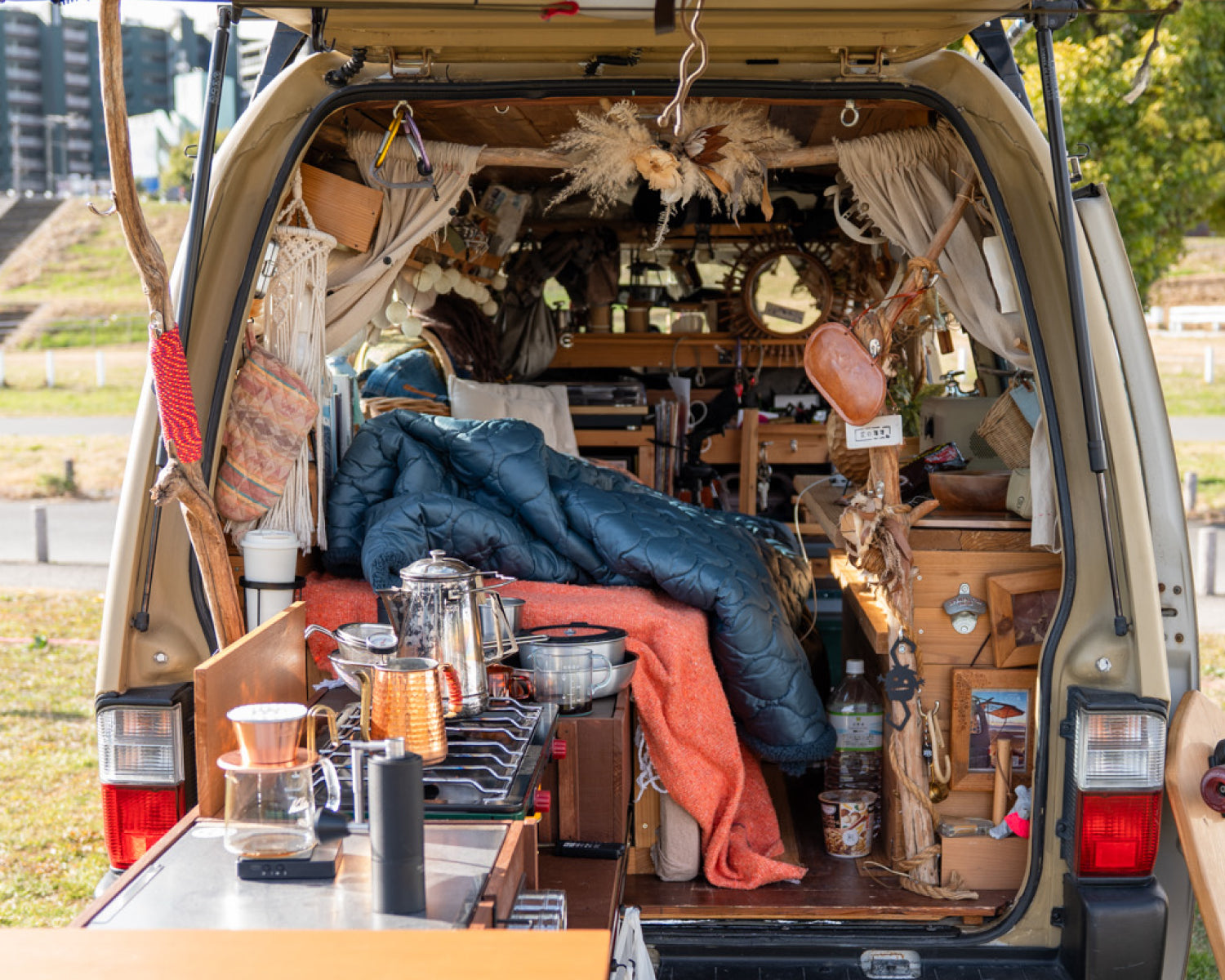 山小屋をイメージした木の温もりある車内には、自作のスライド式キッチン台を備え、設営はわずか1分。車を停め、湯を沸かし、コーヒーを淹れる。手間をかけずに立ち上がるこの空間こそが、三輪さんにとって日常から切り替わる瞬間。こうしてバンライフならではの贅沢な時間を楽しんでいる。