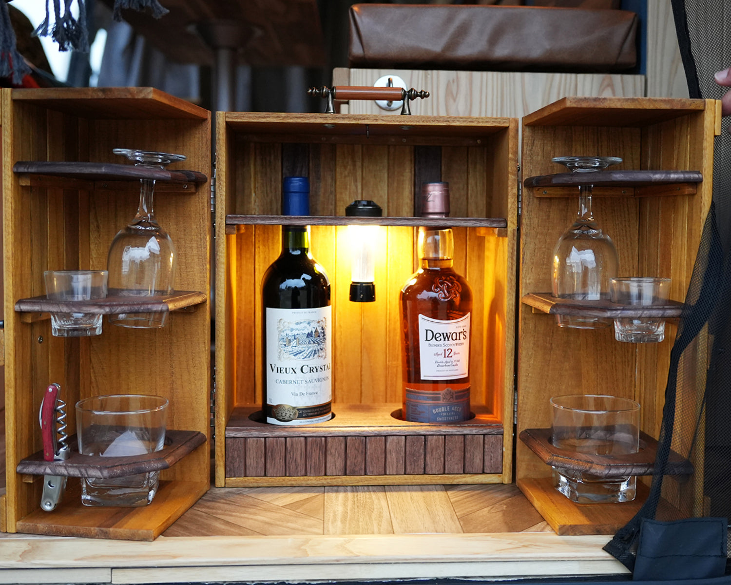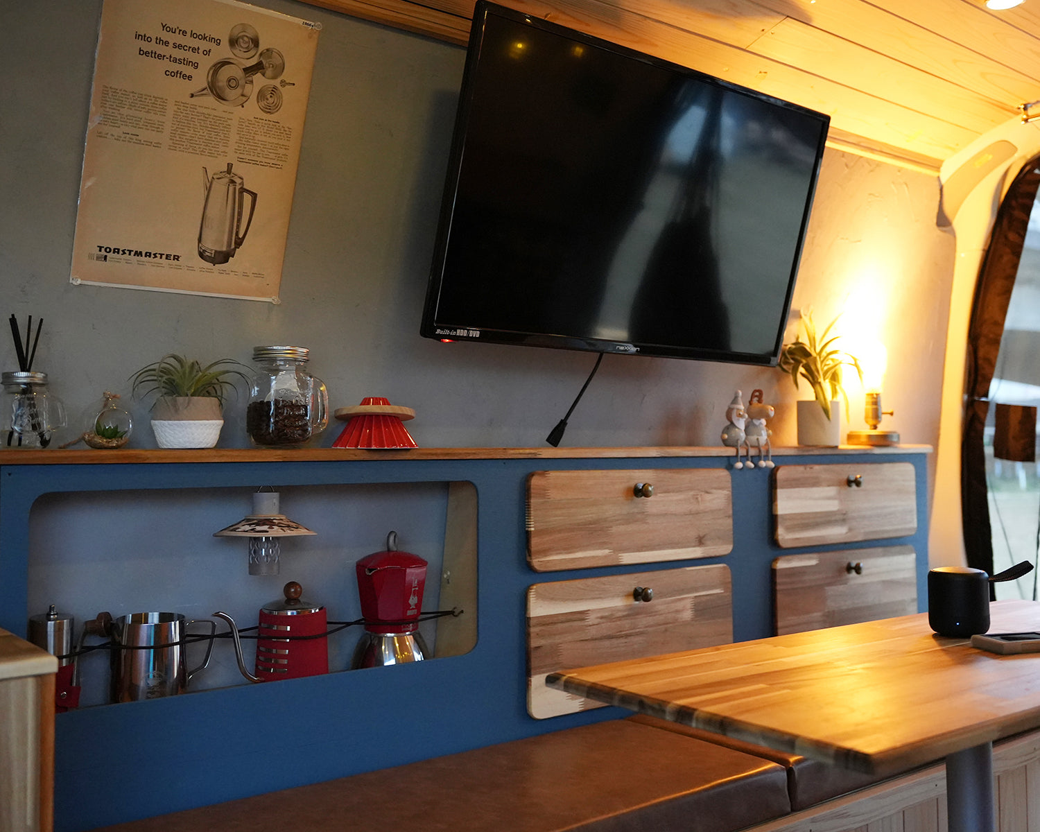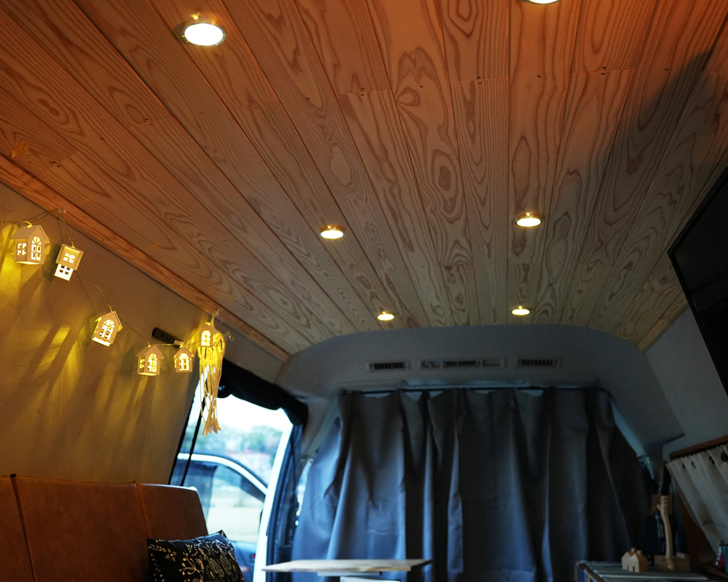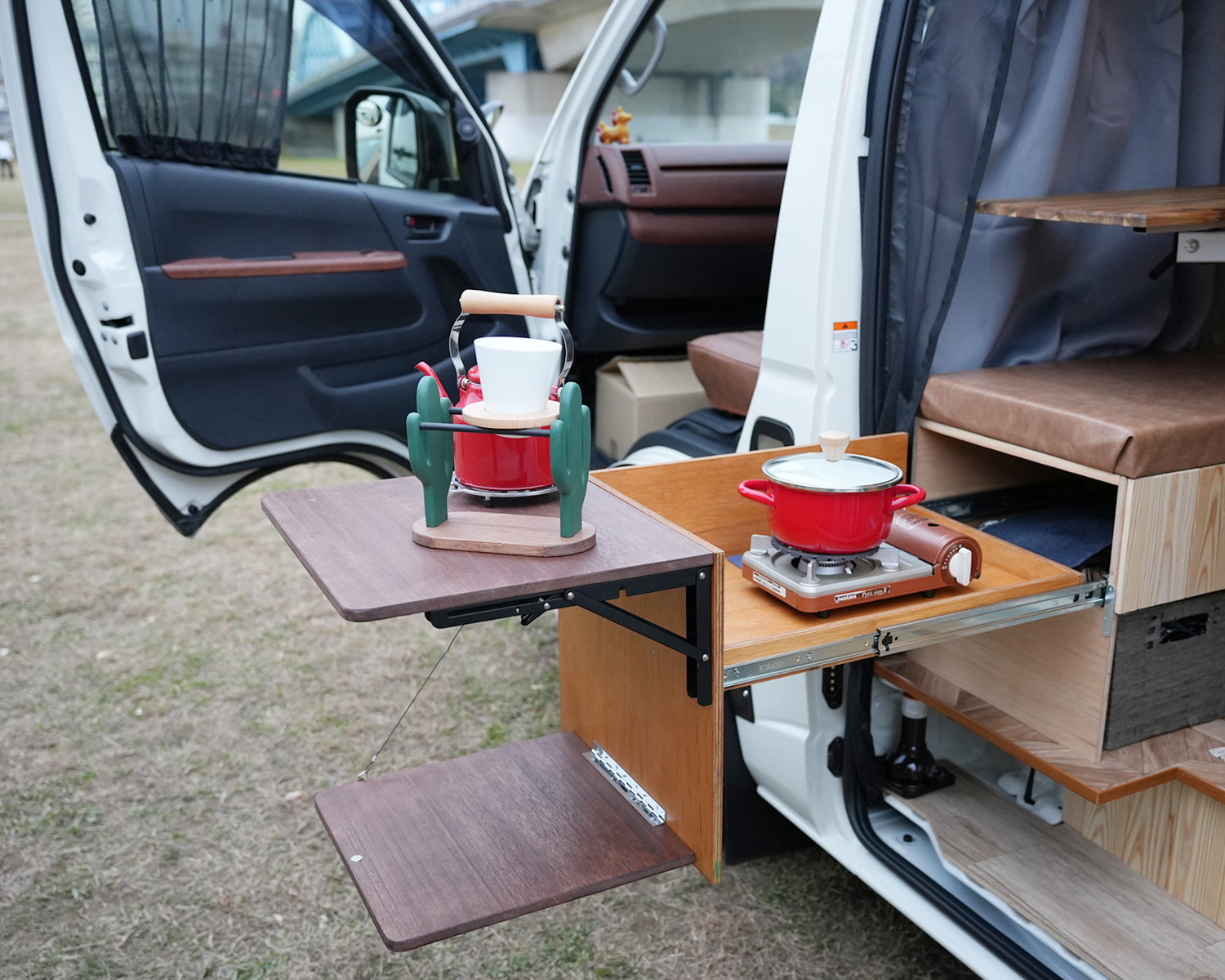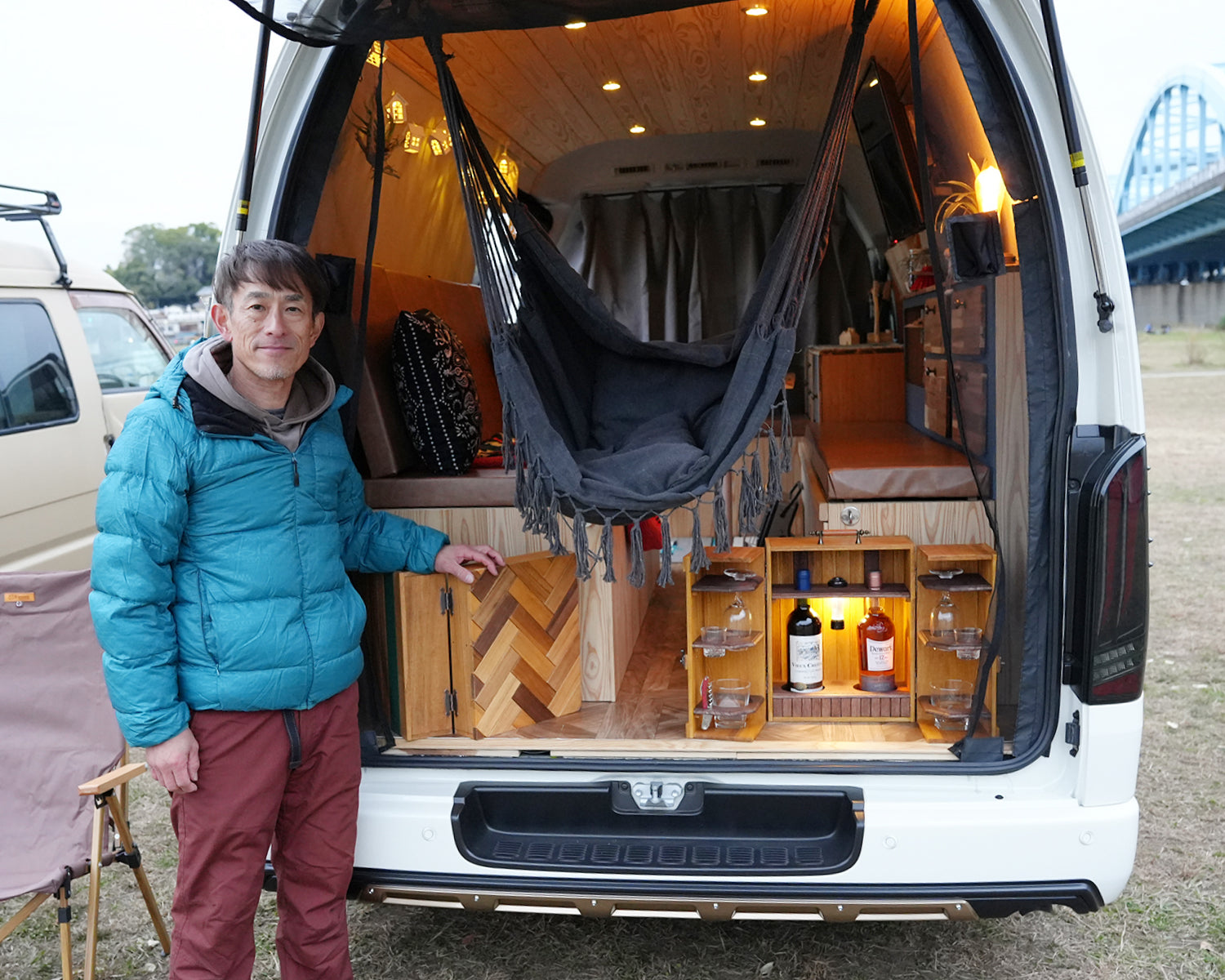 現在のハイエースはフルカスタム仕様。内装のコンセプトは「カフェ」。漆喰の壁に、計算された照明の陰影が落ち着いた空気を生み出している。スライド式の調理台をはじめ、内装や装備はすべてDIY。外遊びで身体を動かし、車に戻って料理をしたり、くつろいだりする。その切り替えを心地よくしてくれるこの一台は、アウトドアと日常をなめらかにつなぐ“ベースキャンプ”のような存在だ。