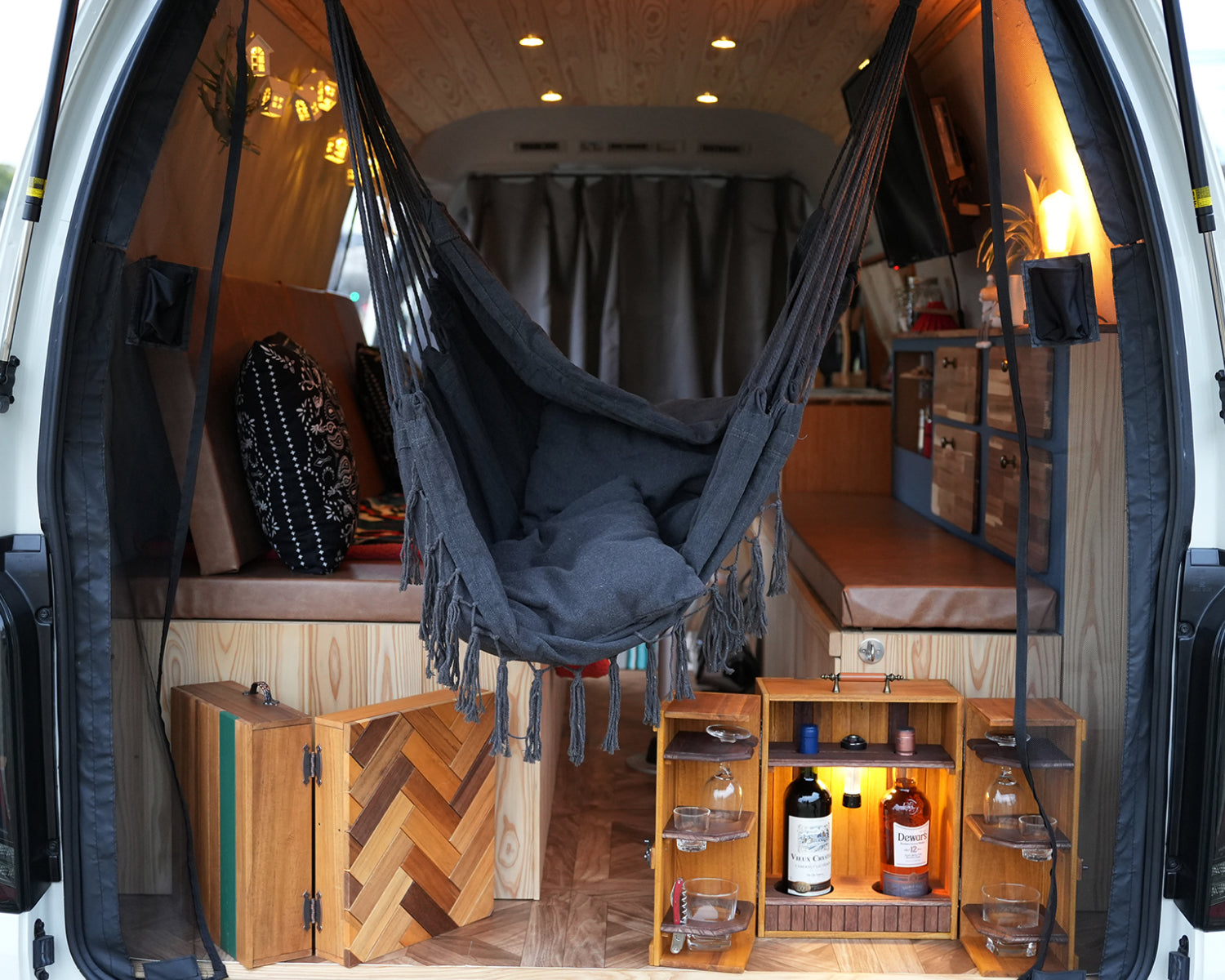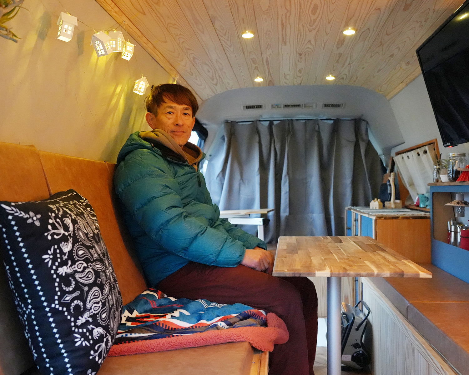 車内にはハンモックを設え、扉を開ければ目の前に絶景が広がる。お気に入りの景色を前に、ゆっくりとお酒を楽しむ時間が何よりの至福だという。冬は雪山へ、夏は水辺へ。スノーボード、SUP、サイクリングと、季節ごとにフィールドを変えながら遊び続けるのが、ふくさんのバンライフスタイルだ。