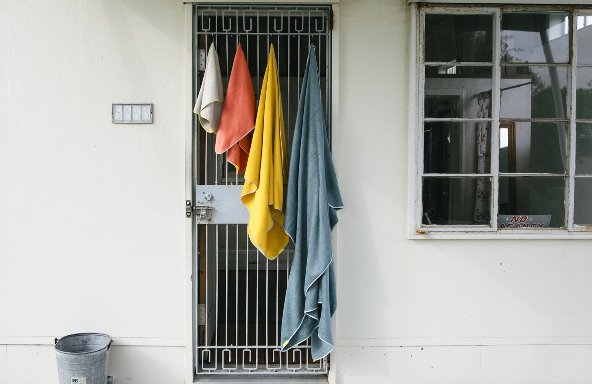 一宮で作られた撚糸を使い、石川県能登町の生地工場でタオルの生地を生産しています。一般的にタオルは織ってつくられることが多いのですが、OUTdryerは、編んで生地を仕立てています。同じく編んでつくるセーターが伸びるように、OUTdryerも構造として伸縮性のあるしなやかな生地となっています。