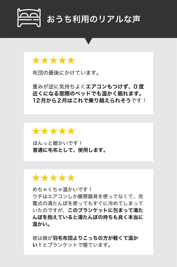 今まで羽毛ふとんと毛布を2枚使っていた方から、Lサイズの魔法瓶ブランケットなら1枚で十分温かいというお声もいただいています。