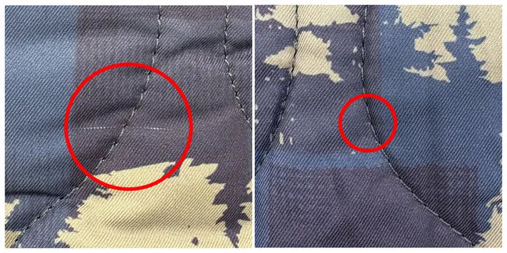 A:こちらは不良ではございません。今回の魔法瓶ブランケットEdge(エッジ)は、デジタルプリントを施した生地を使用しております。そのため、僅かですが針が入る部分に白い筋が走る"糸ひけ"が発生しております。デジタルプリント生地の特性上、完全になくすことは難しく弊社では不良としてみなさず販売いたします。予めご了承ください。※さらに広がることはございません。ご安心ください。
