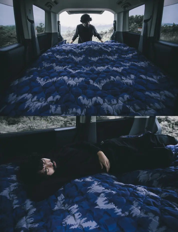 ダブルベッドに近い大きさなので、車中泊だけでなく、毎日の寝具としてもお使いいただけます。