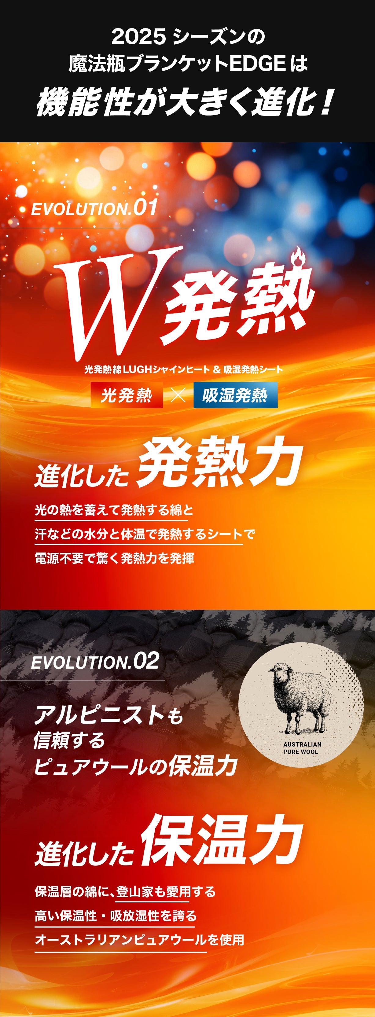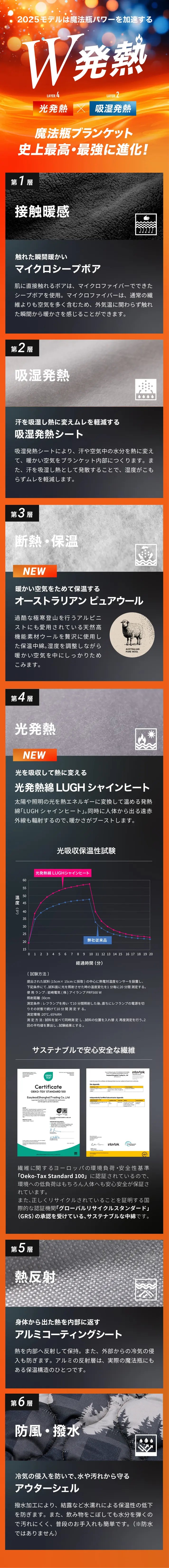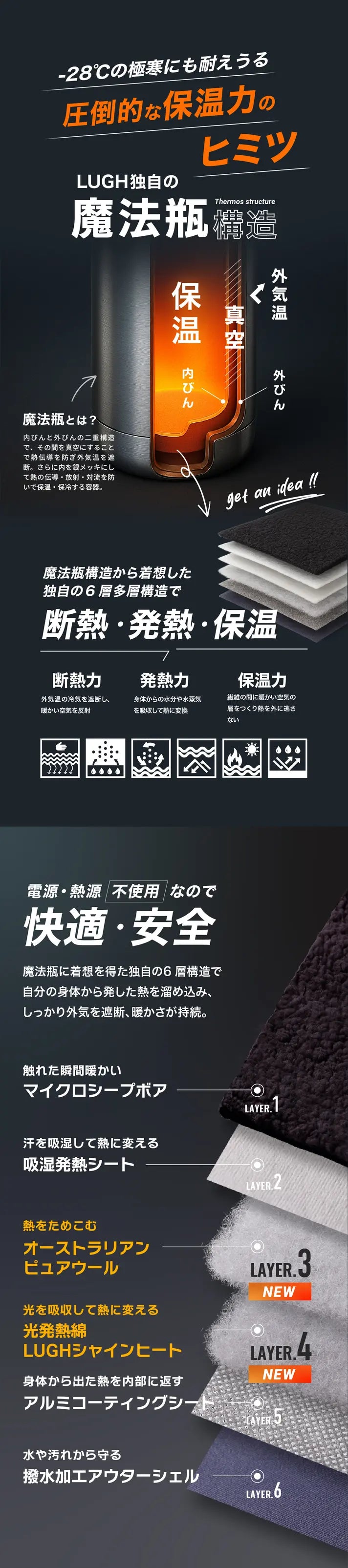 自分の身体から発する熱で温めて、魔法瓶のような構造で冷気を防いで熱をためる独自構造。