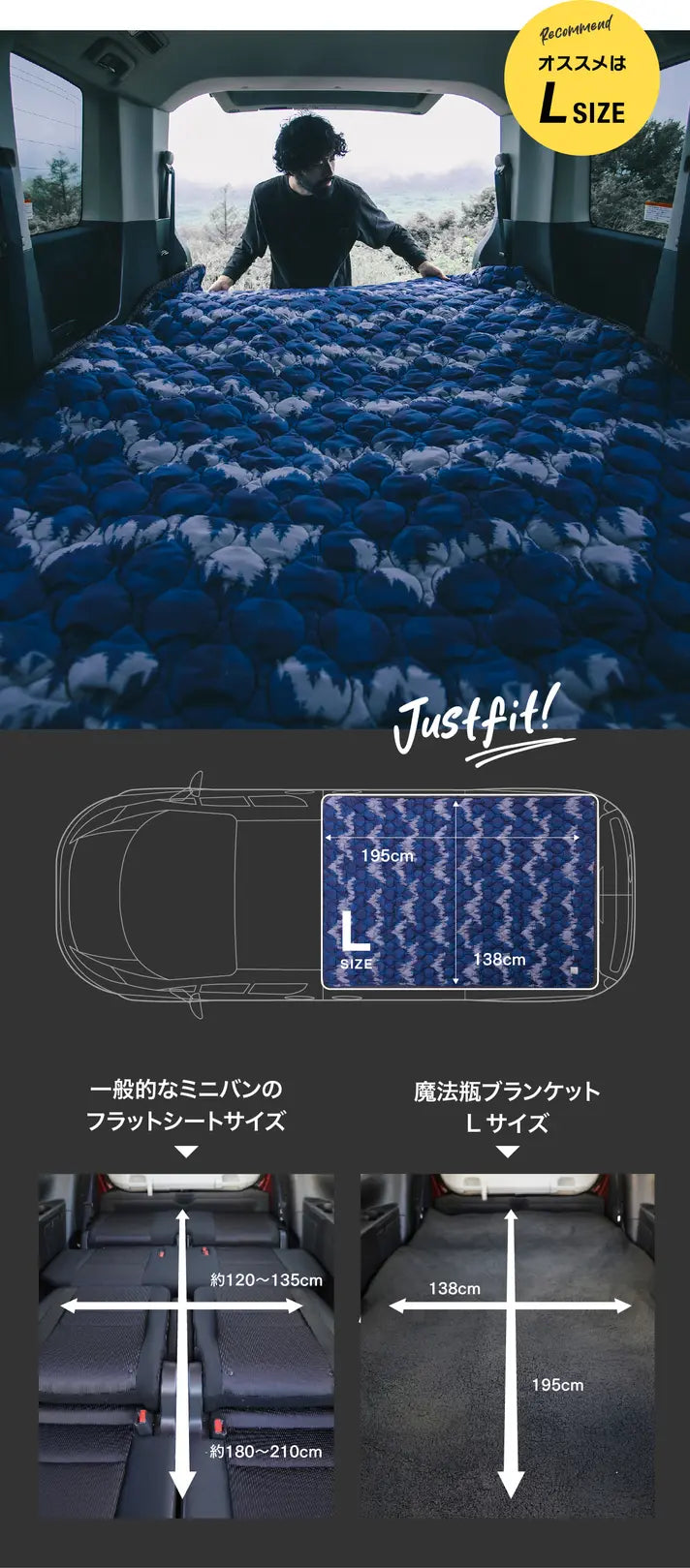 国内主要ミニバンのリアシートをフラットにした場合、奥行き約180〜210cm、幅約120〜135cmが一般的なサイズ。魔法瓶ブランケットLサイズ(約138×195cm)なら、ほとんどの車種のフラットスペースに敷き詰めて使用できるので、車中泊時の底冷えを防ぎます。