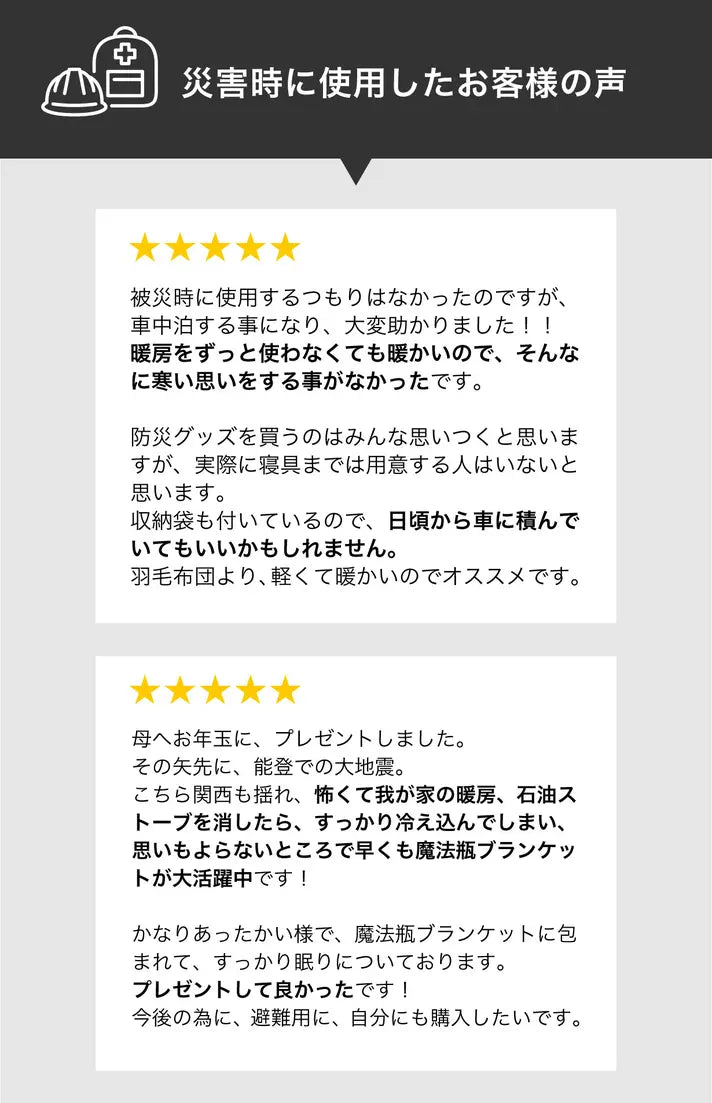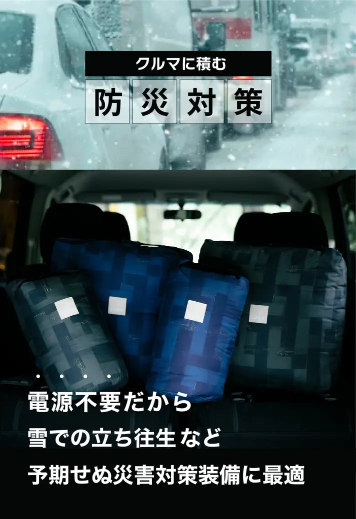 電源不要の魔法瓶ブランケットは、車に積んでおくだけで、いつ起こるかわからない災害にも備えることができます。