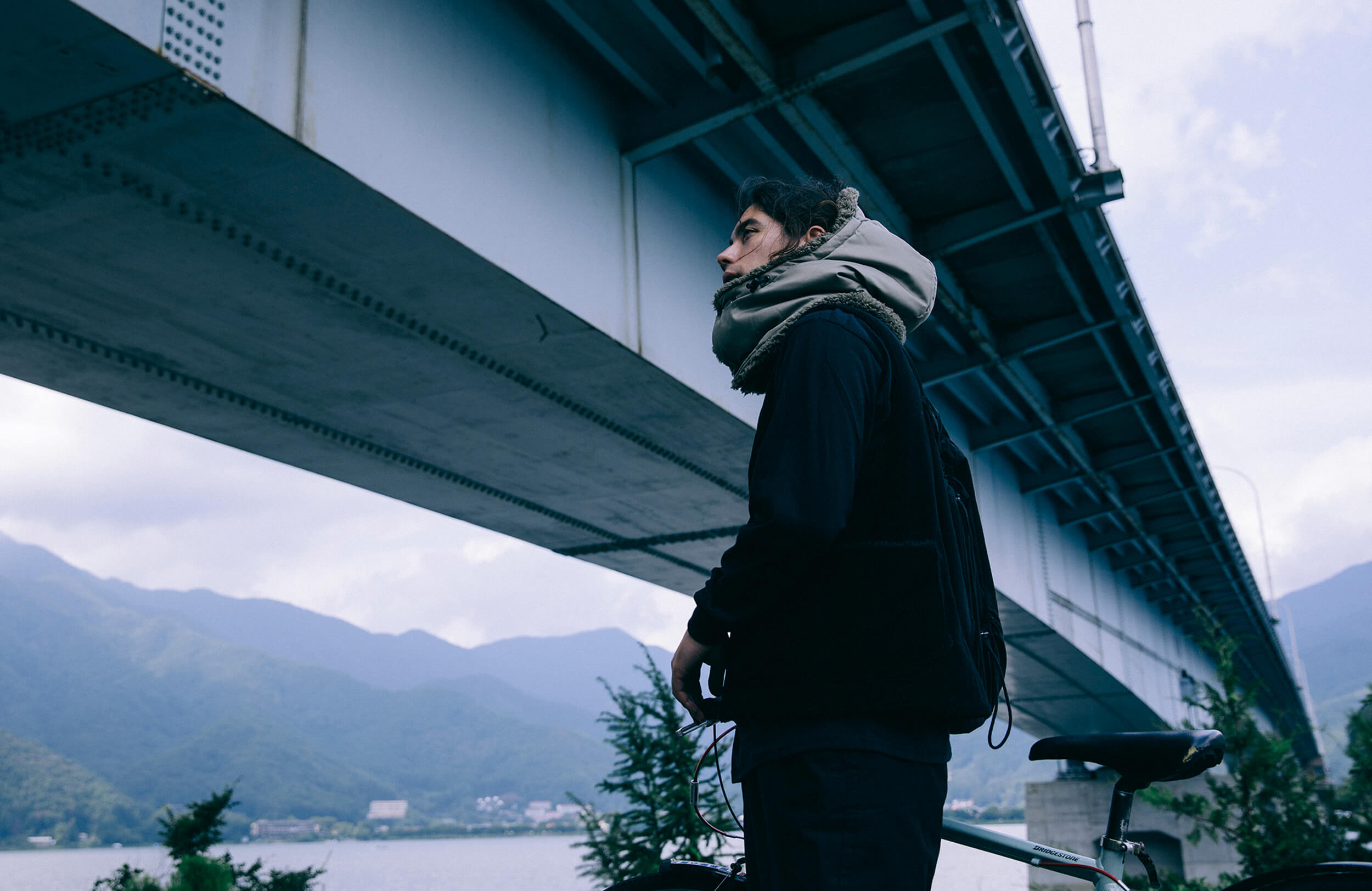 頭全体を寒さから守るフーディタイプの魔法瓶ブランケット。横の視界を遮らないようカッティングしので、自転車の運転もしやすい。