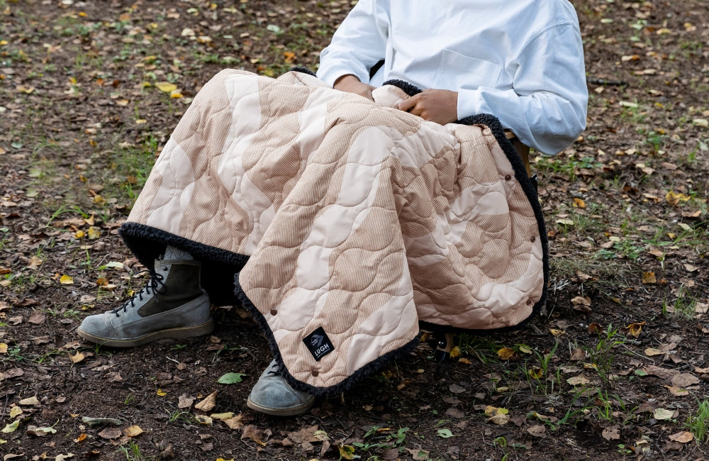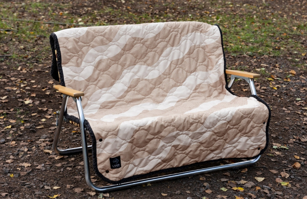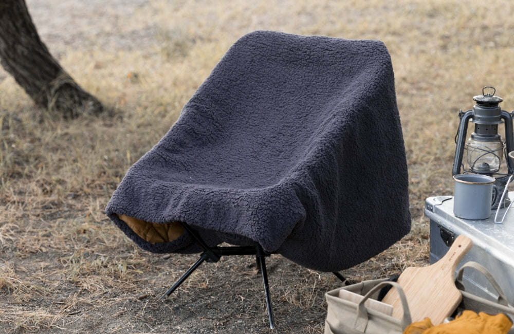 Sサイズの魔法瓶ブランケットは、ヘリノックスのようなロースタイルチェアのシートウォーマーにぴったり。ボタンを背面で留めることでずり落ち防止できるので、立ったり座ったりする度に、かけ直す手間がはぶけるのもおすすめできるポイント。
