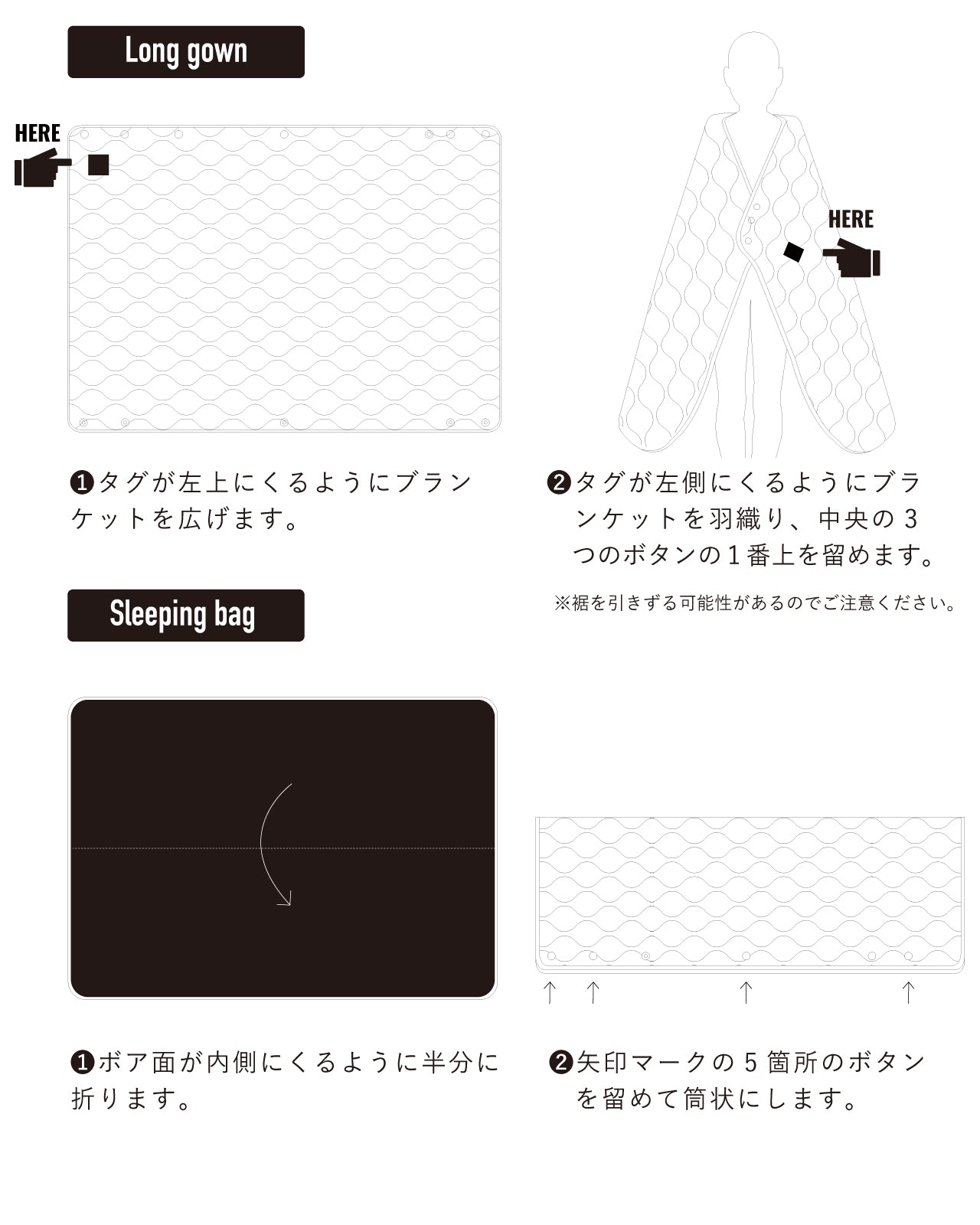Lサイズは138×195センチとたっぷりとした長さ。両サイドのボタンを留めることで筒状になり、保温性がアップ。1枚でもしっかり男性が足元まで包まれる程の大きさ。