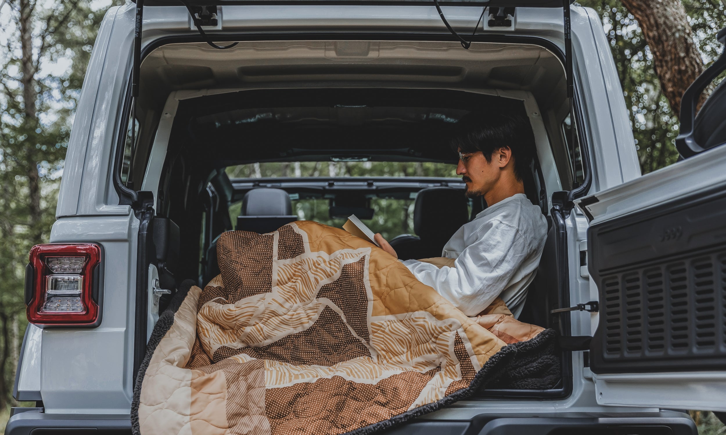 ミニバンサイズにぴったりの大判サイズでラグや毛布として。男性が寝てもしっかり足元までくるまれるゆったりとした大きさ。ラグと毛布としての2枚使用で、電気毛布のような暖かさを発揮します。