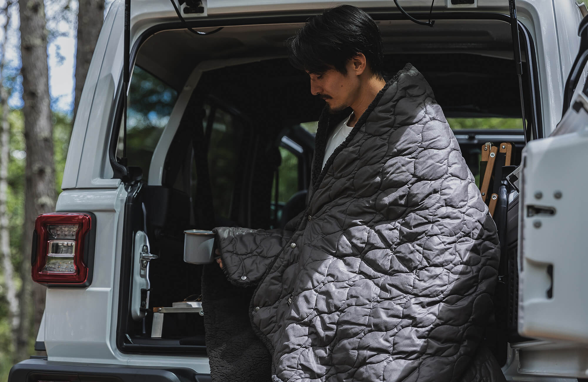 Lサイズは、138×195センチ。フロントのボタンを留めるだけでポンチョとして使えます。両手があくので、なにかと動きがちな車中泊キャンプでも、作業しながら使えます。