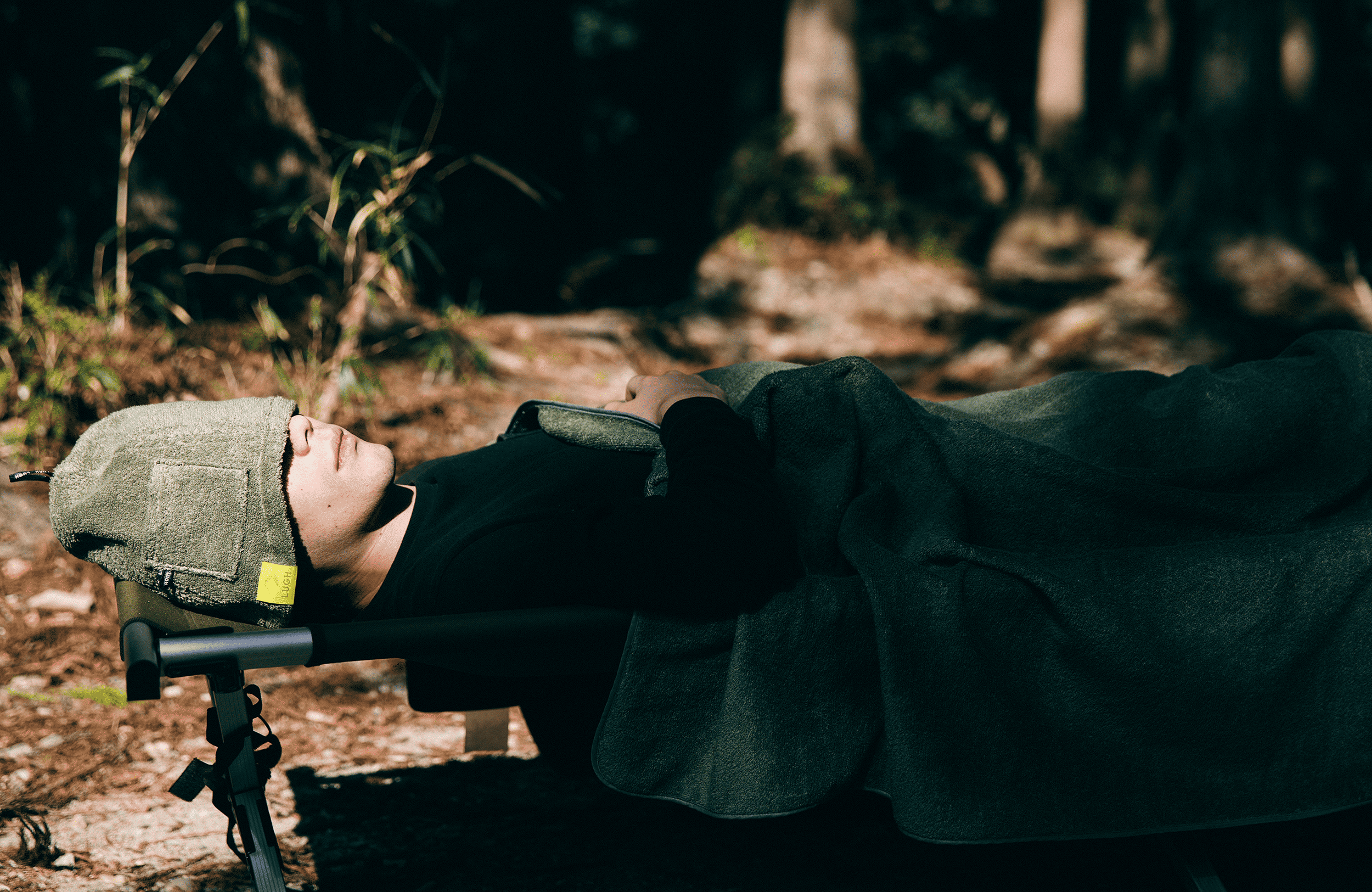 前後で長さの異なるシルエットの2WAYデザイン。視界を確保したい時は浅い方を前に、睡眠や瞑想など周囲の視線を遮りたい時は深い方を前にして着用できます。