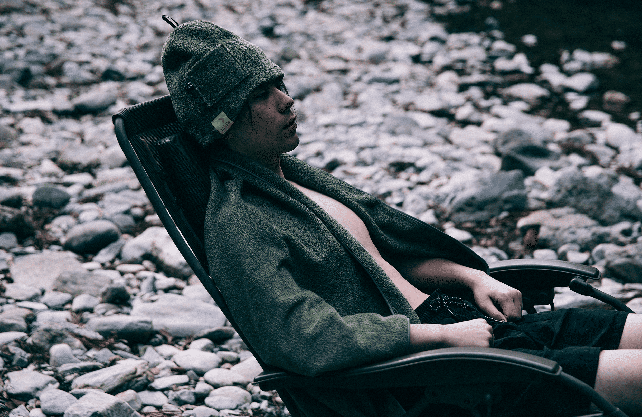 ご安心ください。肌に触れる部分はコットンを使用した撚糸です。リラックスハットは、ベースとなるグランド生地と肌に触れるループの2つで構成されており、ベースとなるグランド生地に糸をループ状に編み込んで作られています。OUTdryerは、ベース部分に乾きやすいポリエステルを使用しています。